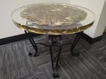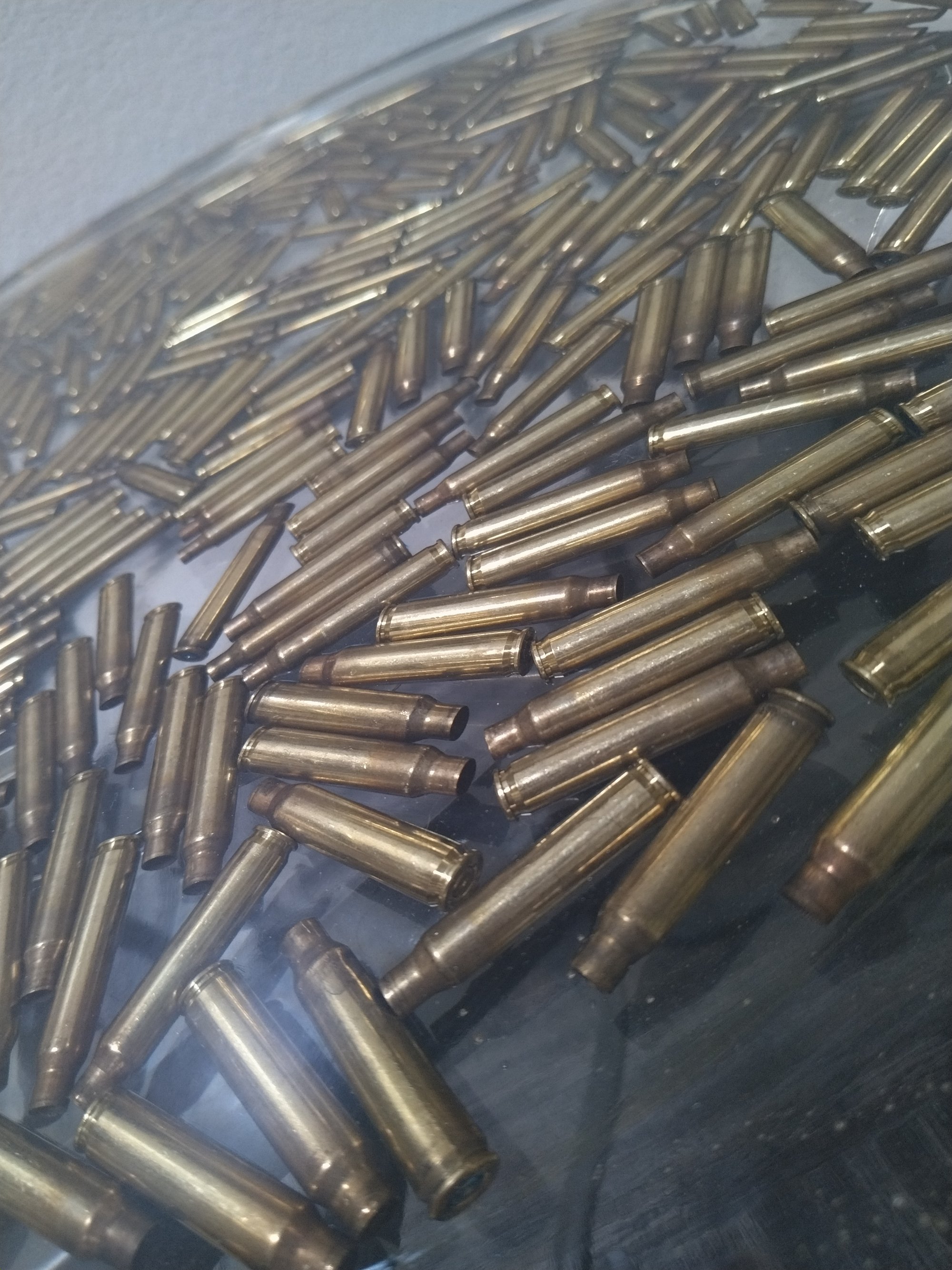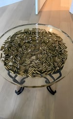 Made from 249 once-fired (OFB) .223 (5.7mm) rifle casings within 2 gallons of clear, air-vacuumed resin. Tabletop measures 24" wide and 19.5" tall.