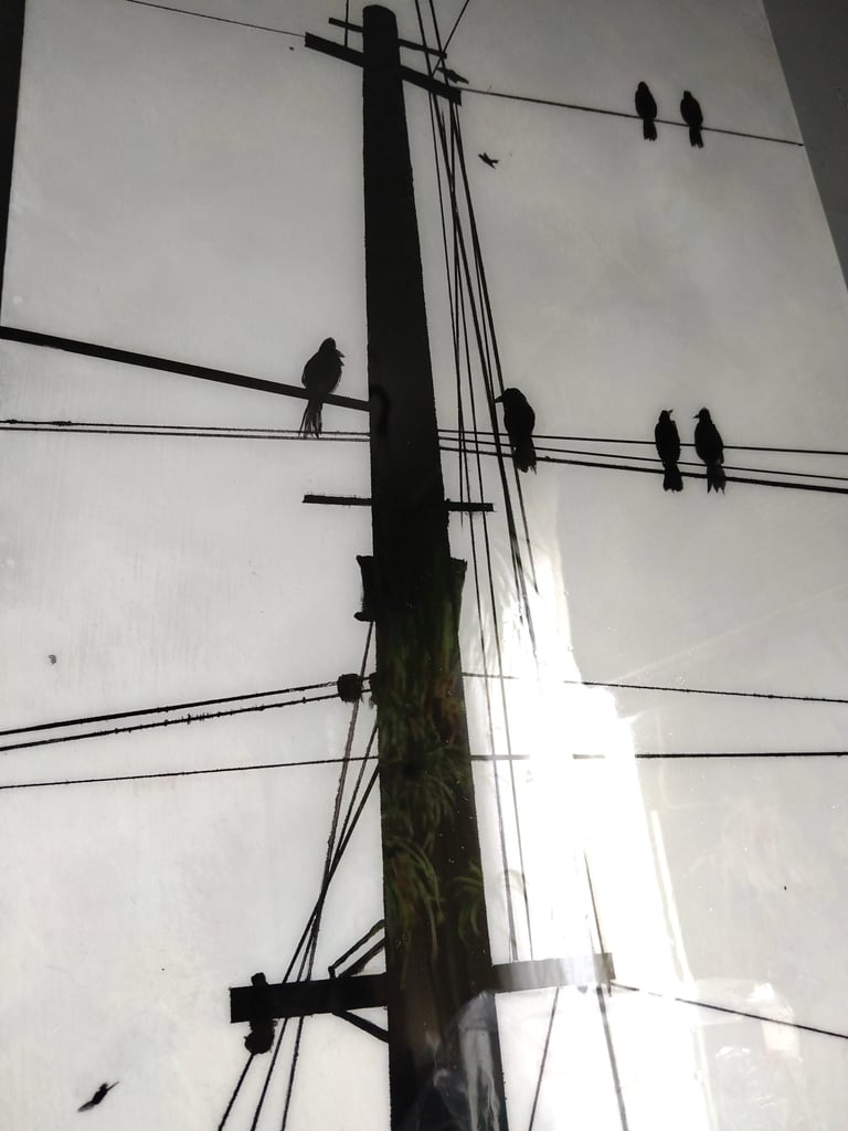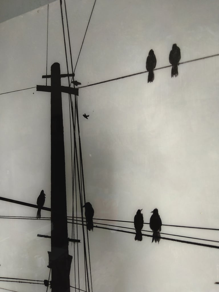 The last work of 2024 from the SILHOUETTE SERIES, 'Birds on Telephone Wires' measures 16x22, acrylic on wood, coated in resin for a glass-like surface. Hangs by sawtooth hardware on backside.