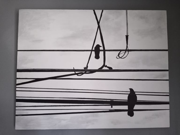 First of the new 'Silhouette Series' two birds rest on an abundance of electrical wires on a cloudy day. Measures 16x20"; Painted with both acrylic and oil on stretched, aged canvas. Varnished. Includes Certificate of Authenticity.