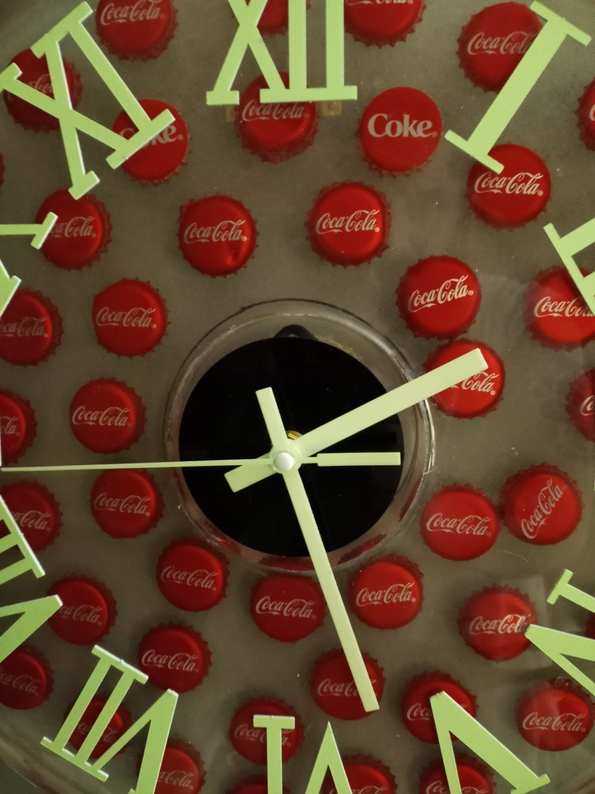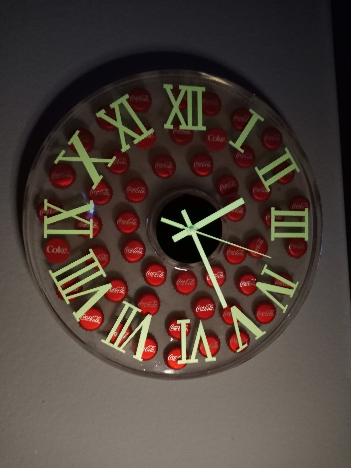 Clock measures 14" in diameter and 1" thick. Bottle caps in clear resin. Numbers and hands glow in the dark. Requires AA battery. Includes Certificate of Authenticity.