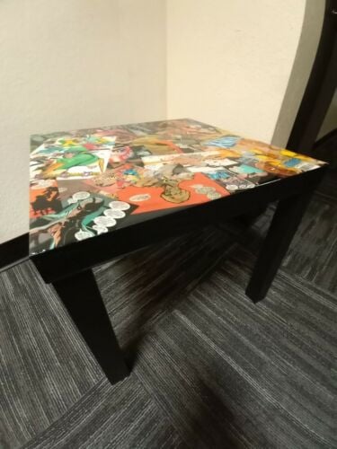 The table measures 23in x 23in x 17.5in tall. The table top portion measures 2in thick. Surface displays resin coated Uncanny X-Men comic covers and pages. Consists of X-Men issues 332, 333 and 330. Includes Certificate of Authenticity and original assembly booklet.