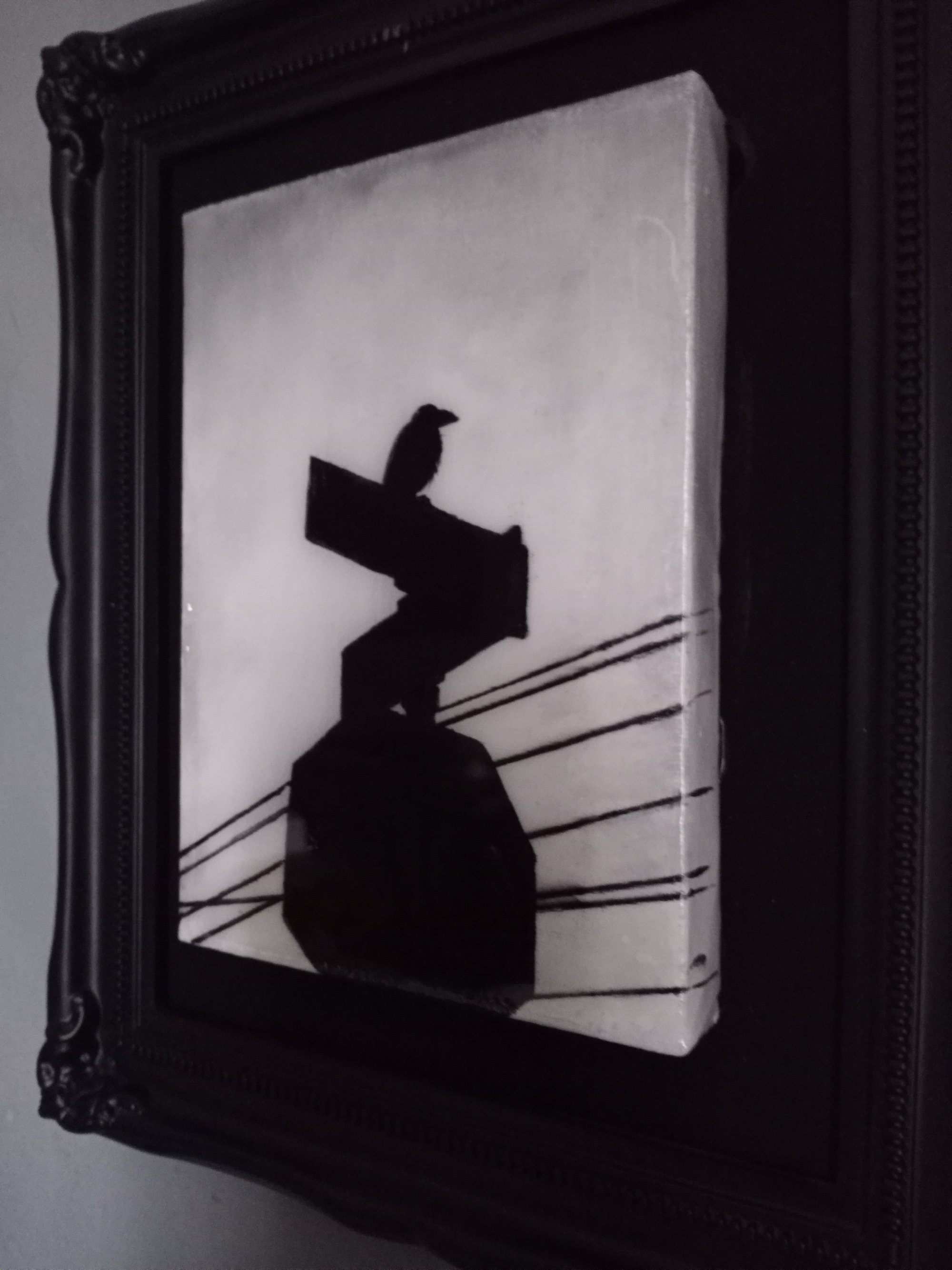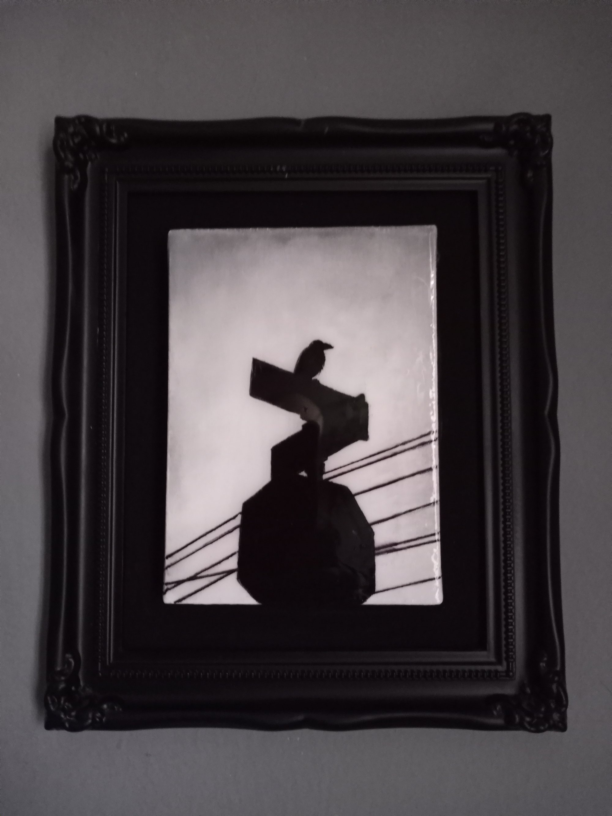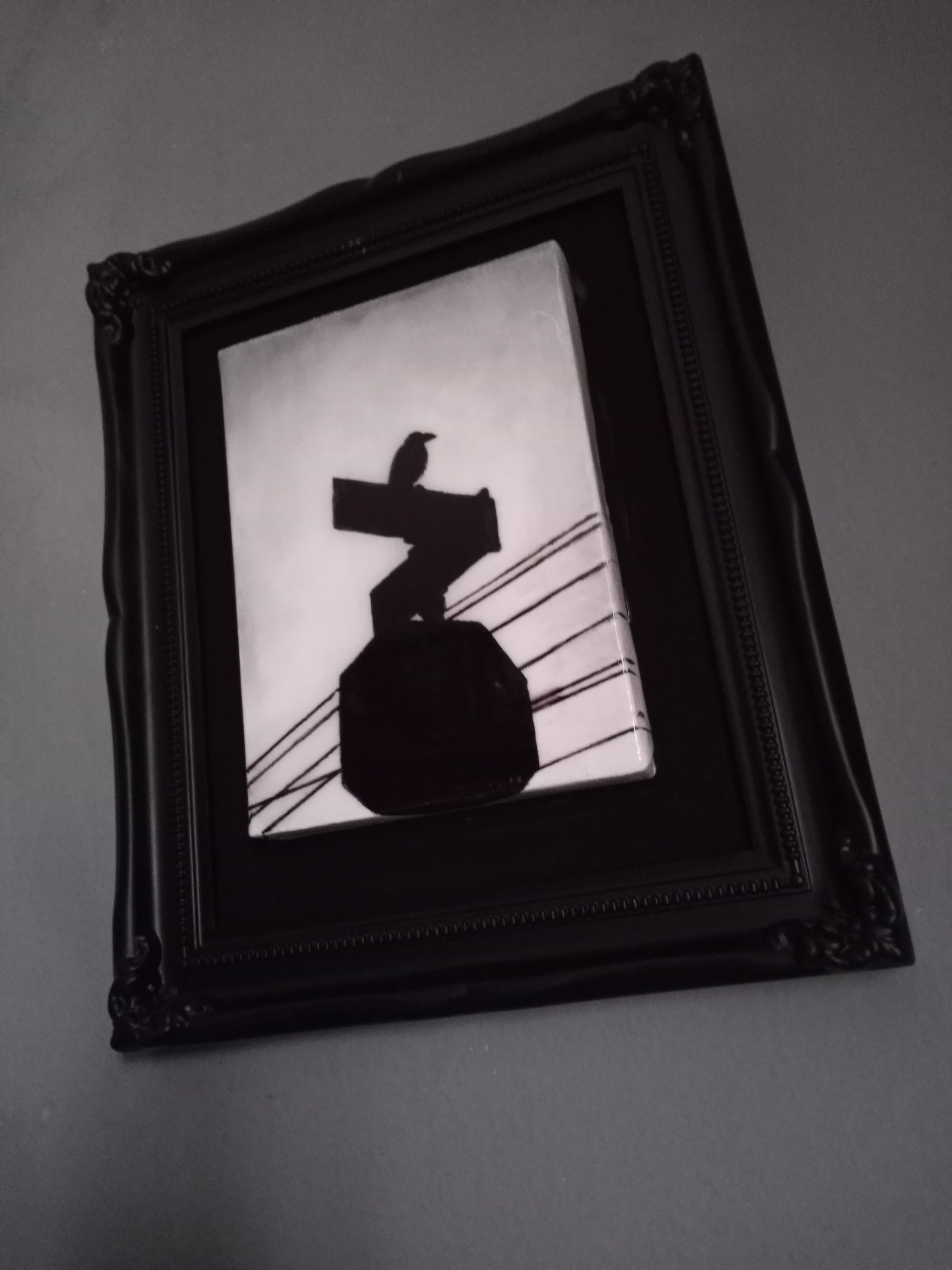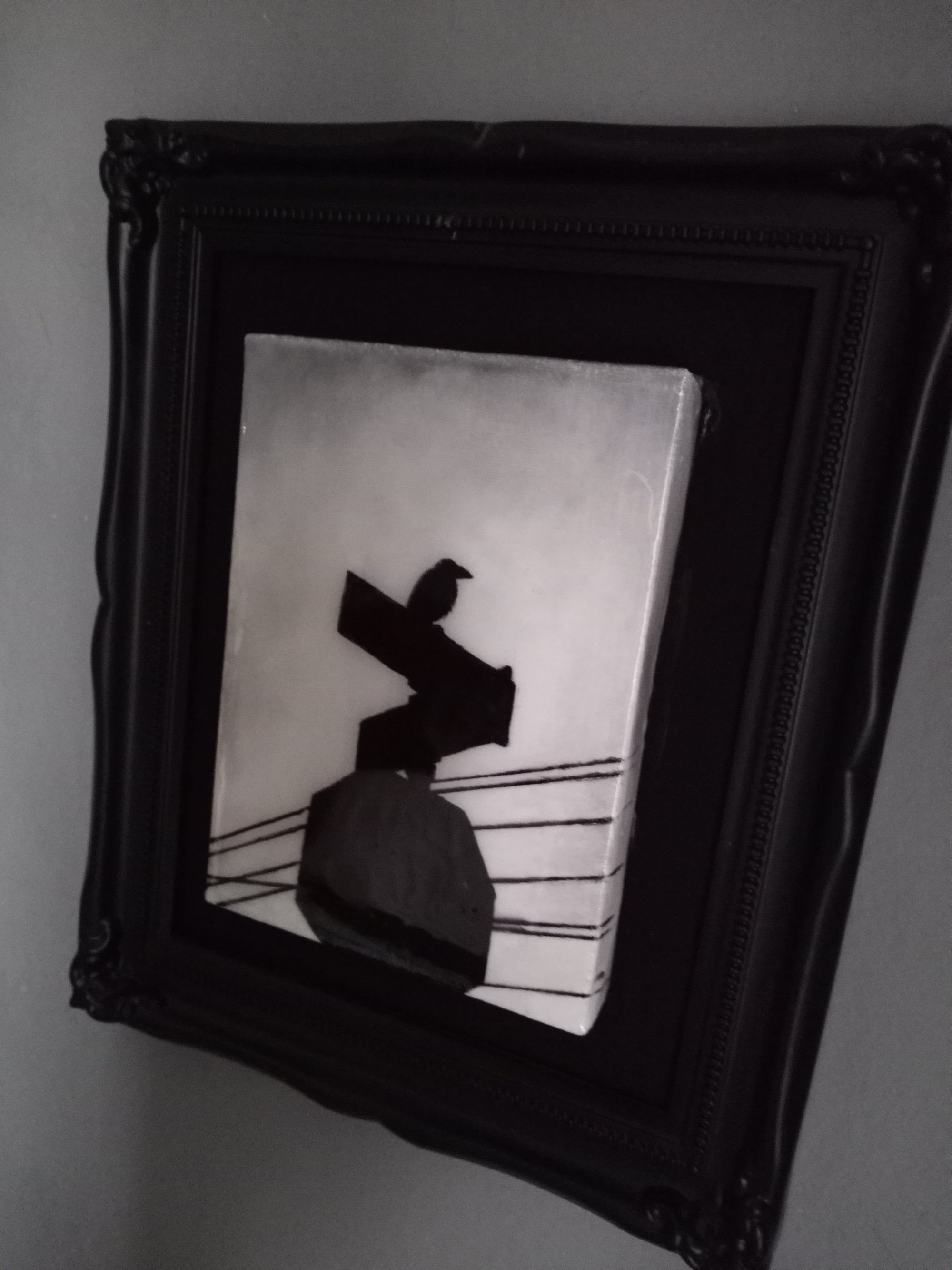 A smaller version of Haro's 'Bird on a Sign' painting, this piece is painted in both acrylic and oil on a small stretched canvas and then placed on a surface which has been painted with non-reflective black paint. This gives the canvas the illusion that it's floating. The canvas measures 5x7" and the entire frame measures 9.5x11.5". Painting is coated in epoxy resin for a glass-like finish. Includes Certificate of Authenticity.