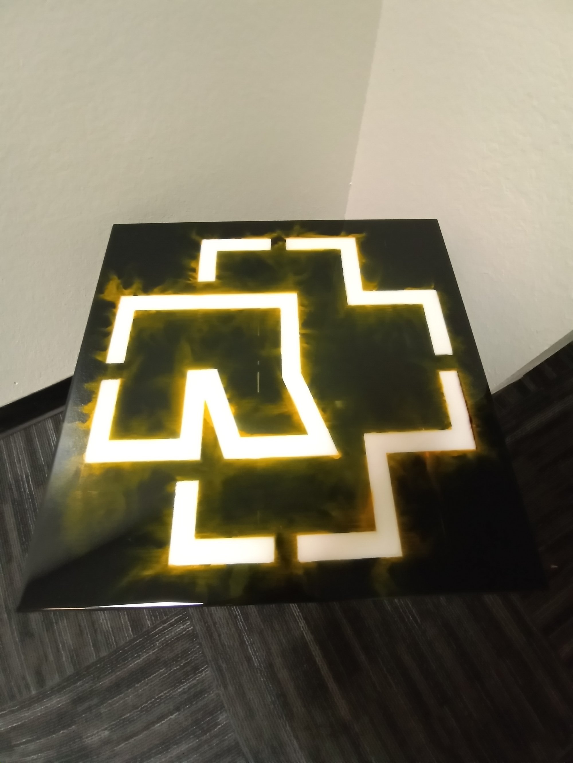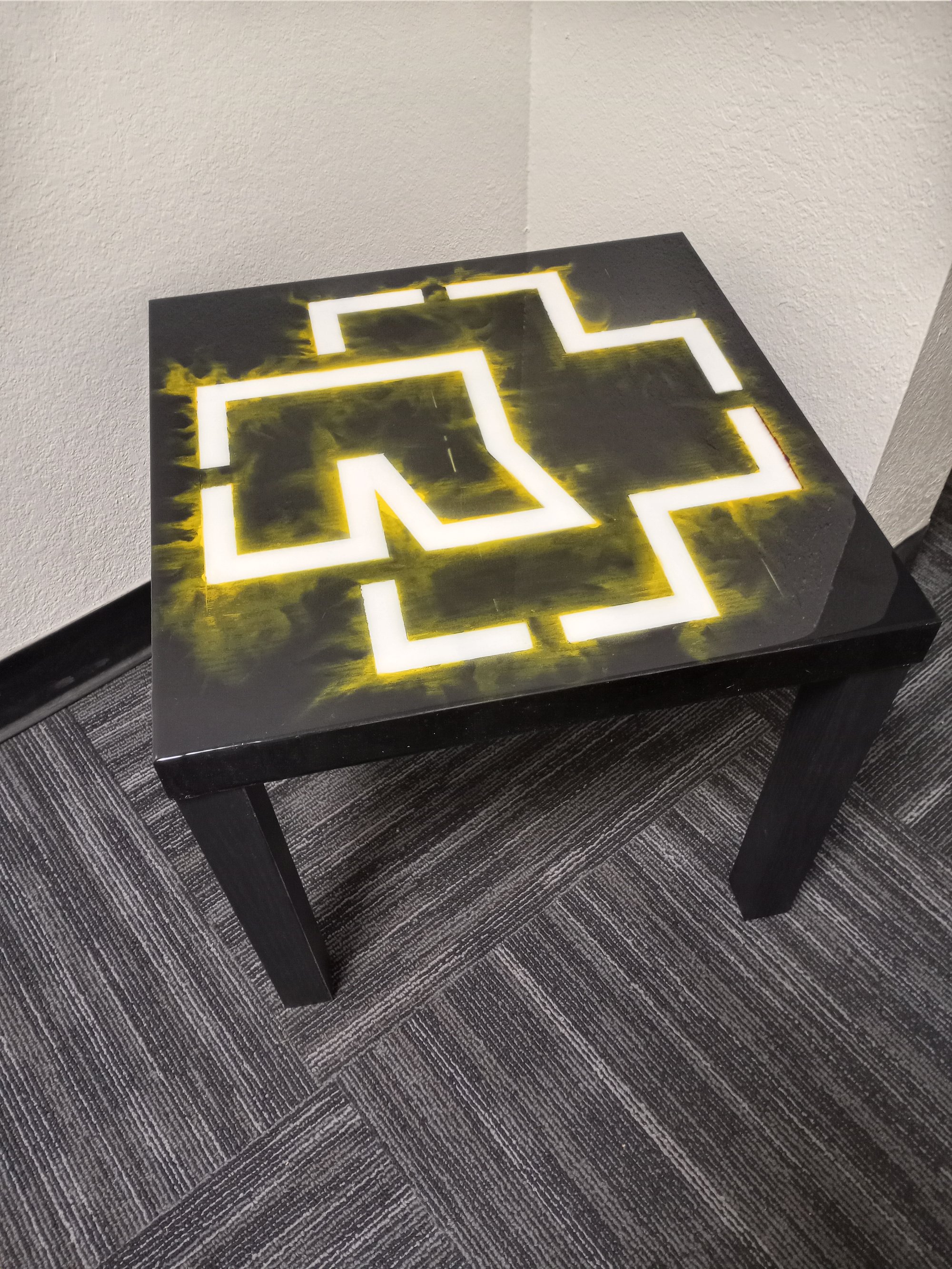 End Table measures 21in x 21in x 19 tall. Ramm logo and flames are meticulously crafted and painted by hand with Acrylic Super White, Oil and Resin cast. Limited supply in celebration of Rammstein's arrival to North America. Limited quantity.